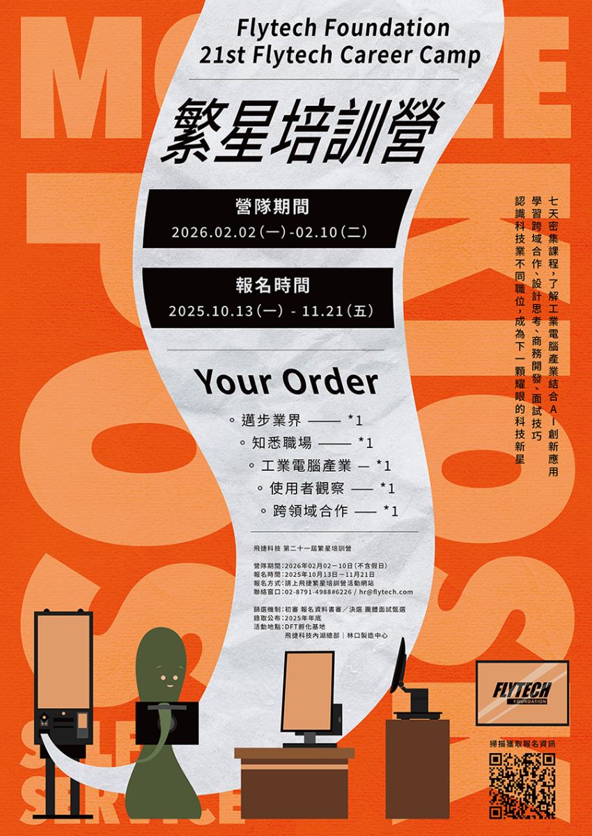 【飛捷科技】2026 繁星培訓營開放報名 發佈日期 2025/11/4 飛捷科技將於2026/02/02(一)~2026/02/10(二)舉辦第21屆繁星培訓營活動,目前已開放報名。 本活動為針對大學&研究所學生辦理的七天營隊,無科系限制。 只要同學對於科技業有興趣,且想與跨領域夥伴一起腦力激盪、互動交流,都歡迎報名參加。