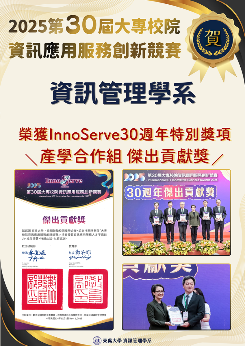 賀!資管系榮獲2025第30屆大專校院資訊應用服務創新競賽InnoServer30周年特別獎項!!