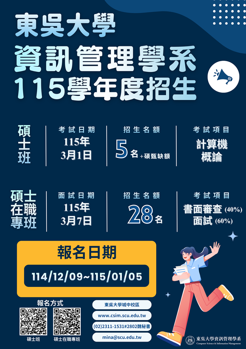東吳大學資訊管理學系115學年度碩士班暨碩士在職專班招生公告
