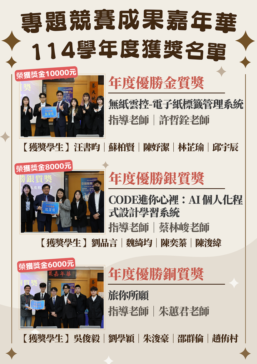 賀!114學年度專題競賽成果嘉年華獲獎名單!