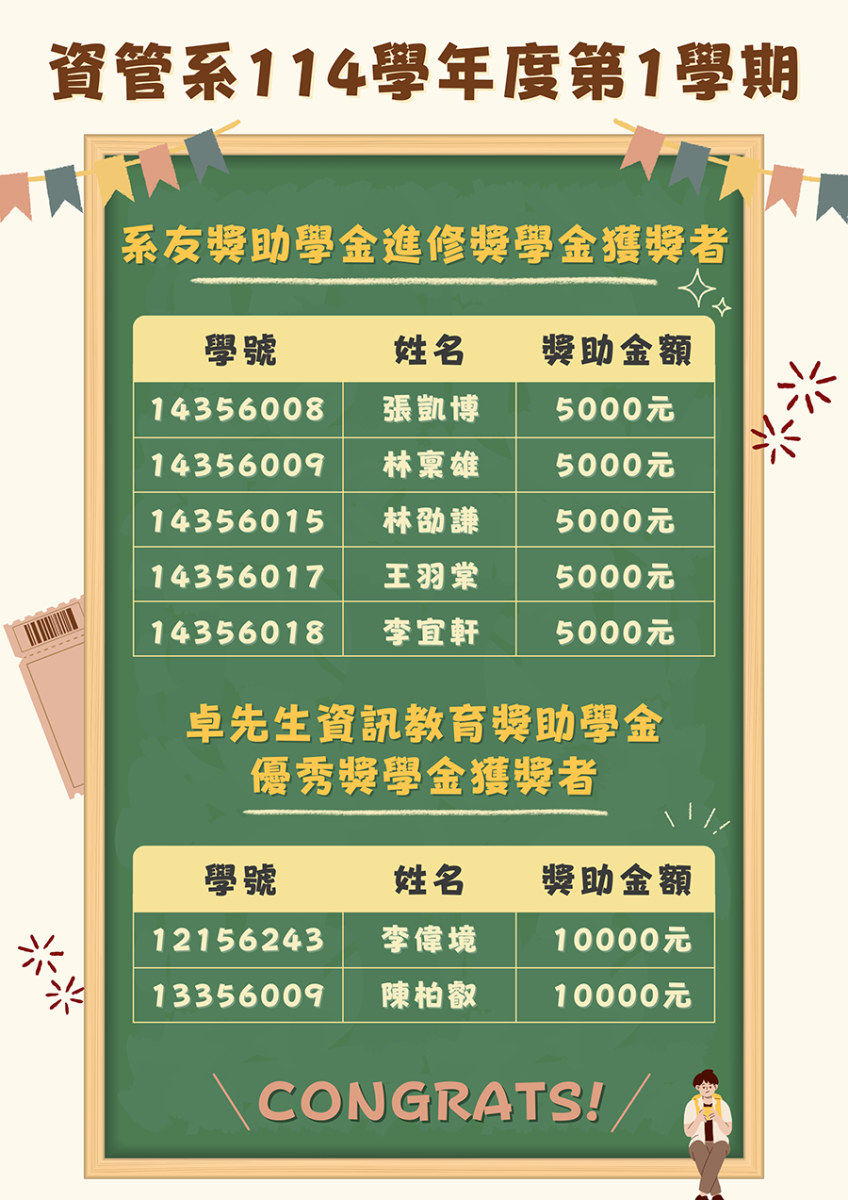 114學年度第1學期資訊管理學系獎助學金獲獎名單