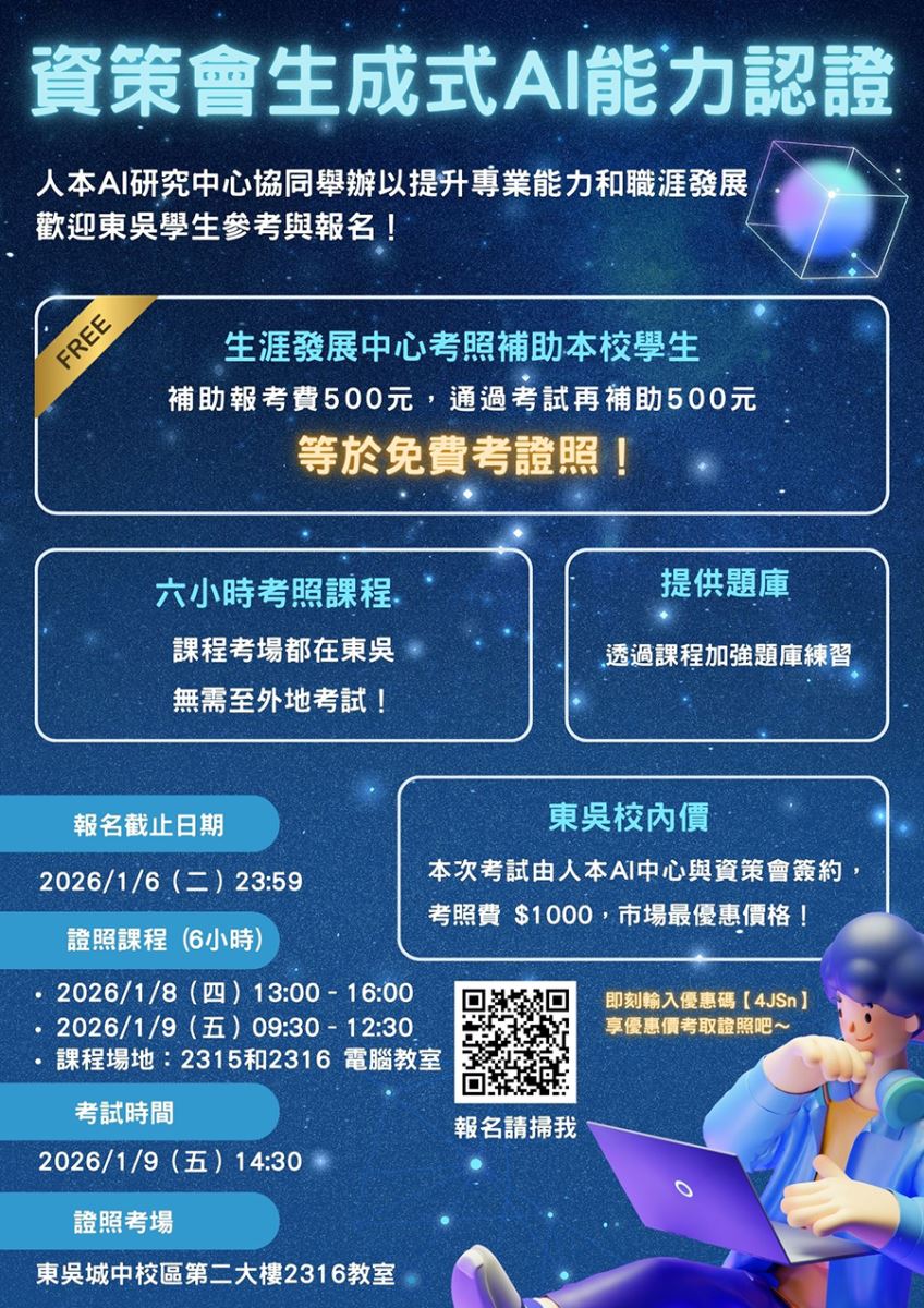 資策會生成式AI能力認證,東吳大學包班考試! 發佈日期 2026/1/2 2026/1/9 東吳大學(包班考試) 1.麻煩同學點選報名連結https://www.iiiedu.org.tw/certifications/privates/scu-edu/6 2.完成註冊 3.再點一次報名連結,即可進行報名https://www.iiiedu.org.tw/certifications/privates/scu-edu/6 輸入推薦碼【4JSn】後,享第一次1000元考試 已設定延長報名時間到2026/1/6(二) 23:59,請考生務必在期限前完成報名及繳費,以利前置作業,謝謝 本次有含免費六小時證照培訓課程,請到名師輔助考照,因為教室空間有限,只開放80位報名證照考,即可上課。 本次證照考,生涯發展中心優先補助,不需抽籤。但高教深耕經費有限,等補助經費用完,下個梯次不一定能補助。請有需要的同學把握機會。